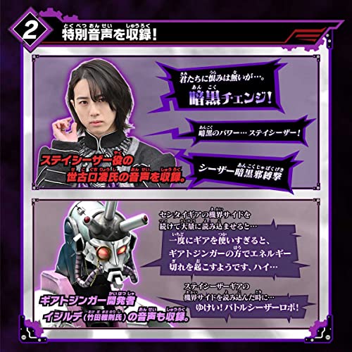This product is a transformation item that is used when the Stacey appeared in the "Sky Sentai Senkaijer" (performer: Yoru Jukuchi). Open the cover of the main unit and set the stacesar gear. and pull the trigger to activate the transformation into the staceaeser. After transformation, turn the handle further to activate a special trick. This product also includes the Dark Sentai Gear from the movie, "Gorengeer", "Joul Ranger", "Gao Ranger" Set it on the main body and turn the handle to activate the Dark Sentai Gear and Barrel rotate, to activate the summoning sound of fake sentai heroes. You can also set the back of the Dark Sentai Gear and perform the Same action to activate the summoning sound of a fake squadron robot. This product also includes special voices from Stacy/Staceser (performance: Yaru Seikuchi) and Ijirde (performance: Masanori Takeda), which appeared as the developer of Gear Tozinger in the movie.The stacesar gear included with this product is not compatible with the "All-World Transformation Gun" DX Gear Tringer and "Rippet Transformation DX Gear Adalinger" (sold separately).