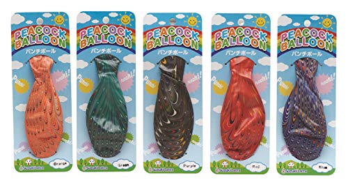 A punch ball with a peacock feather motif, and its name is Peacock Balloon. It is a punching ball that is hard to break and has volume. Each one is carefully made by our own technology. It is a balloon with a beautiful pattern of red, blue, orange, green, and purple. Made from eco-friendly natural rubber. With rubber for punch ball