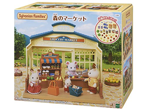This supermarket features brick walls and a green roof.It also has a cash register counter, shelves,and plenty of market produce.All the included produce can be displayed on the shelf.It also comes with a shopping basket for a fun "shopping" experience.You can slide the conveyor belt in the cash register to transfer your groceries to your shopping bag.The walls and flooring of the shop can be detached.Changing the direction they are installedchanges the floor area both inside and outside the shop for more fun. Since the floor size is the same as the separately sold "DH-06 First Sylvanian Families",so they can be lined up alongside perfectly.The figures can also go in and out from the side entrance.It can also be placed on top of the "Red Roof Country Home" (sold separately).Set Contents: Main unit, floor, fence x 2, shelf, cash register counter, scanner, shopping basket, shopping bag, point cards, 2 eggs, 2 large canned goods, 2 small canned goods , 2 milk, apple juice, orange juice, 2 c rackers, 2 cereals, 3 apples, 3 paprikas, 2 lettuce, 3 tomatoes, 2 bananas, 3 oranges (Total: 40 Pieces)