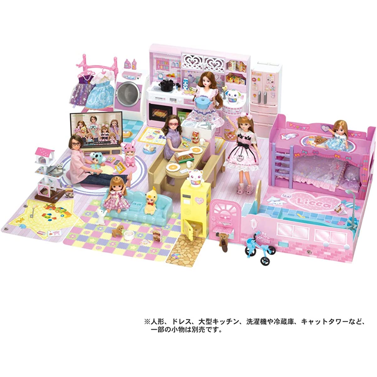 Product introduction This is a great home with furniture that the Licca-chan family. Furniture such as beds, baths, toilets, etc. can be fixed to the wall or the floor. compact storage. Press the switch on the front door to hear a "ping pong" and chime. The LR-22 Cat Type AI Robot will welcome you at the front door, delivery box, robot vacuum cleaner. Enhance your home play, such as toothbrushes and toothpaste. Set Contents: Main unit (1), bed (1), table, chair (1), kitchen (1), shoe box (1), sofa (1), bath ( 1), toilet, (1), runner parts (white, 1), runner parts (light blue color (1), runner parts gray (1), TV board (1), ladder (1), sealing sheet (2) , wooden sheet (2). Safety Warning Copyright Information: (C) TOMY. *Some accessories such as dolls, dresses, large kitchens, washing machines, refrigerators, and cat towers are sold separately. Batteries are not included. ● Children should be accompanied by parents when playing with them. Do not put the toy into mouth. Before using, please refer to the included instruction manual (English language not guaranteed)