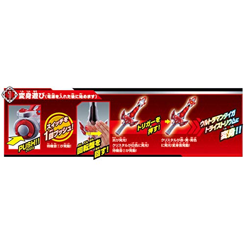 Introducing the DX Tiga Tri-Blade from Ultraman Tiga. Ultraman Tiga uses transformation item and weapon to power up. By turning the rotary plate, the flame effect appears and the transformation sound is activated. There are also 3 types of special attacks and 2 types of super special attacks are activated. Batteries: 2 x AAA batteries (sold separately).