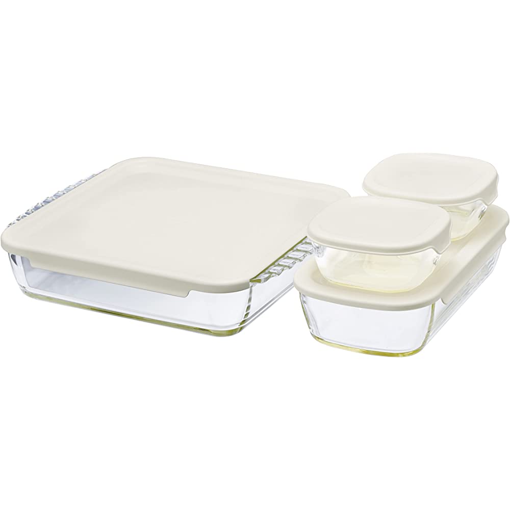 HARIO HKOZ-5004-OW Stacking Heat-Resistant Glass Container, Square, Set of 4, Full Capacity 8.4, 31.4 fl oz (250, 900, 2,000 ml), Lid Included, Microwave Safe, Oven Safe, Made in Japan, Large
