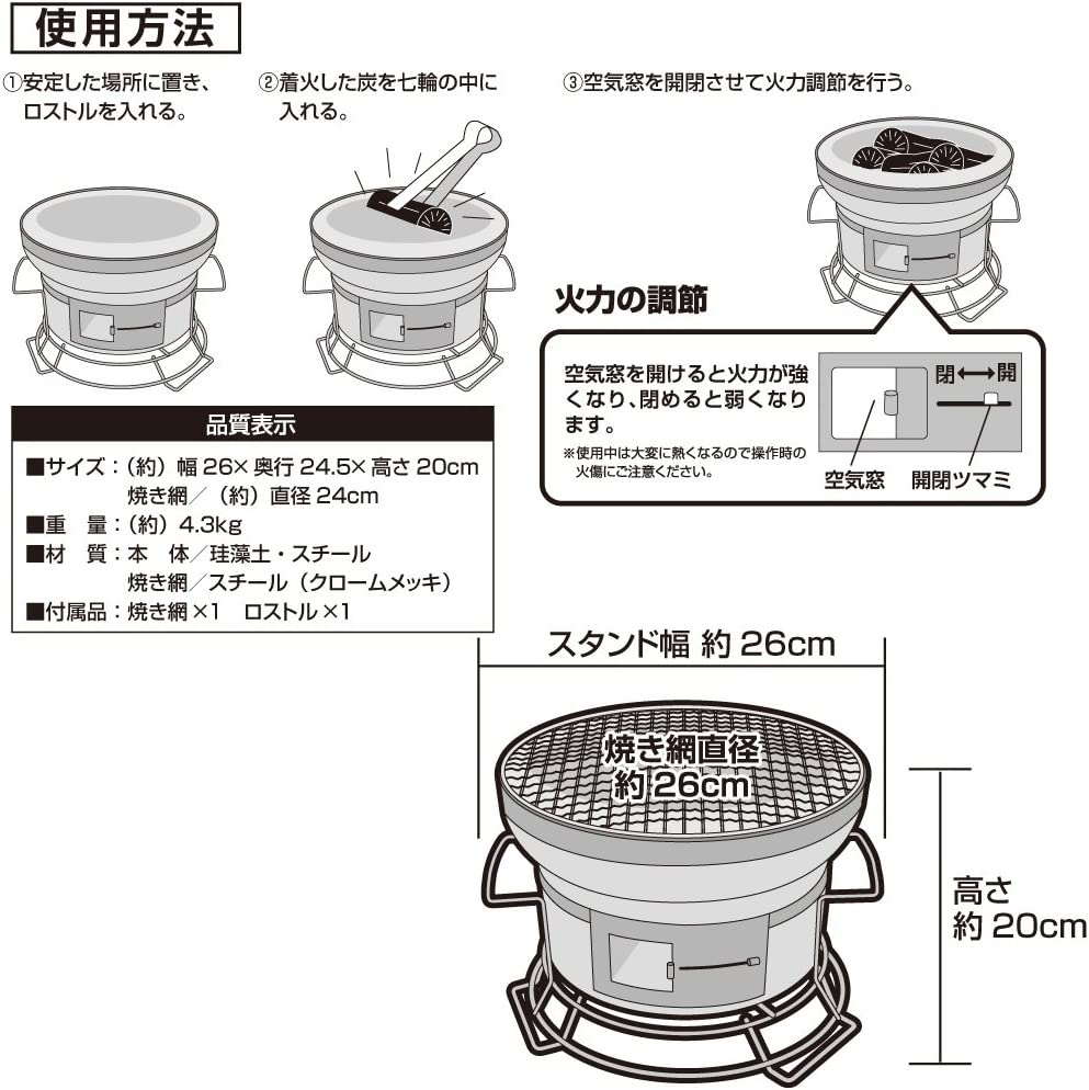 Size (W x D x H): Approx. 10.2 x 9.4 x 7.9 inches (26 x 24 x Baking Area (approximate): Diameter 9.4 inches (24 cm) Material: Main body: Diatomaceous earth, steel Mesh: Steel (chrome plated). Base: Steel (chrome plated) Can be used with bamboo charcoal (BD-442) for 7 wheels Diameter of 7 wheels is approx. 9.4 inches (24 cm) with air window The main unit will not come off from the stand Accessories: Grilling, pedestal Weight: Approx. 9.9 lbs (4.3 kg) Country of Origin: China