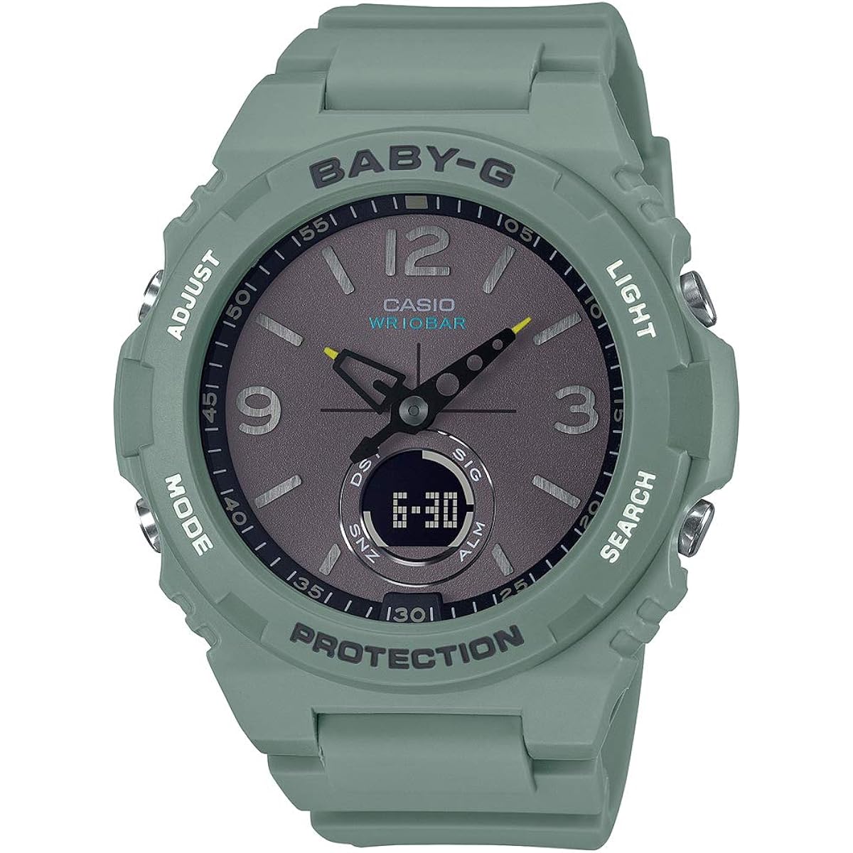 From BABY-G, a casual watch for active women, a vintage-like model that goes well with outdoor style is now available. This time, we have a model that is perfect for outdoor styles such as festivals and camping, with vintage-style faded colors and accent colors. The hour hand has a playful design with a lantern motif, which is an essential item for camping. The function display on the bezel uses phosphorescent paint, making it glow in the dark. It also has a light function, so it is a great item to use even at night. Introducing BABY-G, recommended for an open and natural outdoor style. ●Shockproof structure ●10 ATM waterproof function ●World time: 27 cities around the world (29 time zones, daylight saving time setting function included) + GMT (Greenwich Mean Time) time display ●Stopwatch (1 second, 60 minute meter, with split) ●Timer (Set unit: 1 minute, maximum set: 60 minutes, measurement in 1 second increments, auto repeat, time-up notice function included) - 5 time alarms (only one with snooze function) / time signal - Fully automatic calendar - 12/ 24-hour display switching ● LED light (with super illuminator, afterglow function, afterglow time switching (1.5 seconds/3 seconds)) Brand introduction BABY is a casual women's watch brand born from G-SHOCK for active women. -G. It has a shock-resistant structure that is resistant to shock and vibration, and is waterproof (over 10 atmospheres), making it safe for work around water or water sports, making it not only cute but also extremely practical.