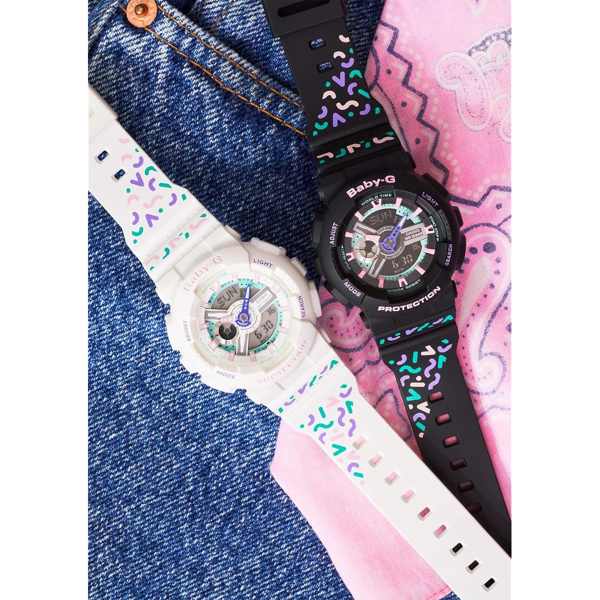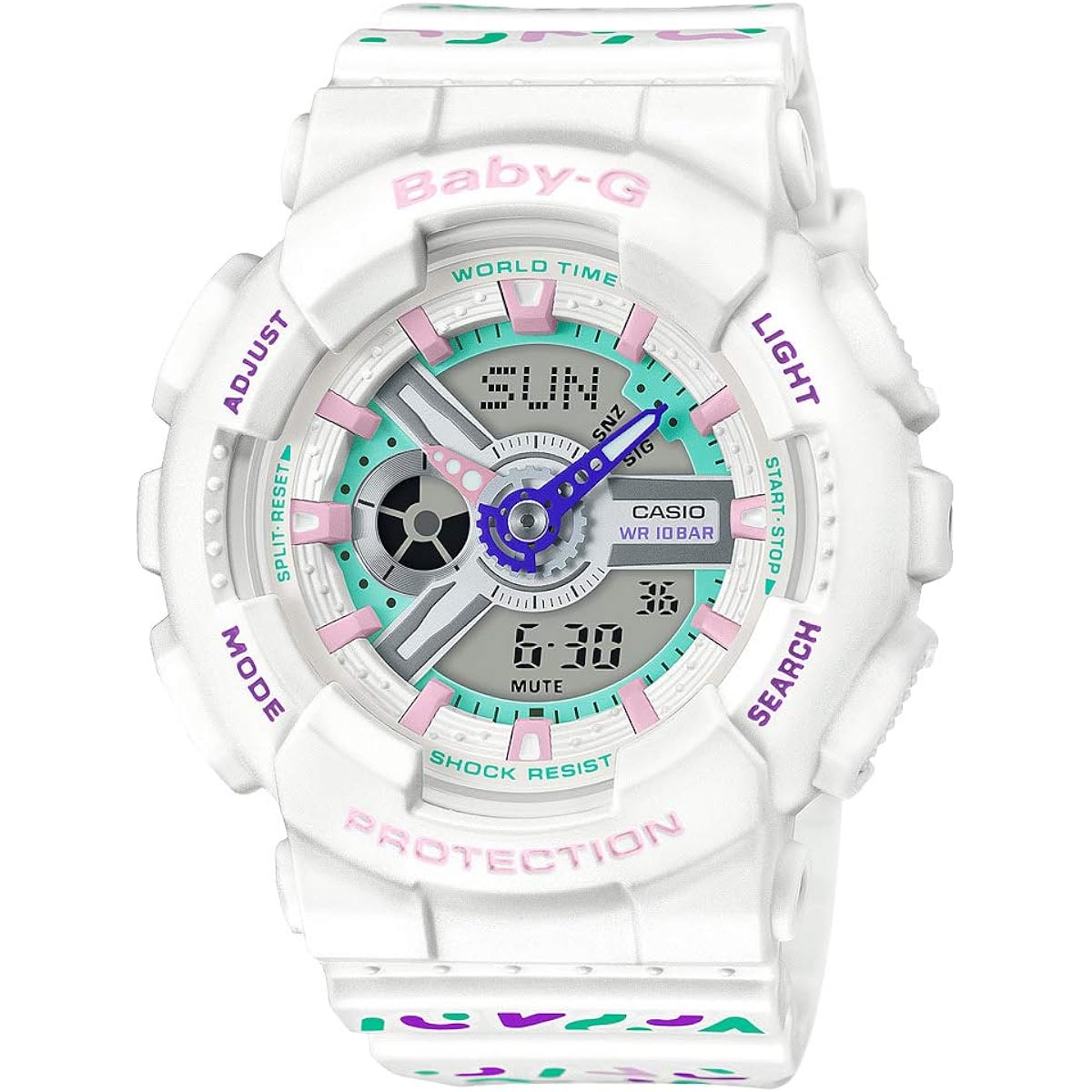 "Geometric pattern" is now available from BABY-G, a casual watch for active women. Based on the BA-110, which is popular for its men's-like design, it has a 90's style design with a colorful GEOMETRIC pattern on the band. By blocking the pattern, it has an edgy finish that changes its expression depending on the angle. The index parts on the dial are also colorfully finished, giving it a POP impression. Introducing a cool model with a cool design that will add just the right amount of impact to your hand. ●Shockproof construction ●10 ATM water resistance ●World time: 48 cities around the world (29 time zones, daylight saving time setting function included) + UTC (coordinated universal time) time display ●Stopwatch (1/100 second, 24-hour meter, with split) ●Timer (set unit: 1 minute, maximum set: 24 hours, measured in 1 second increments) ●5 time alarms (only one with snooze function), time signal ●Full auto calendar ●12/24 hour display switch ●Operation Sound ON/OFF switching function ● LED light (with afterglow function) Brand introduction BABY-G is a casual women's watch brand born from G-SHOCK for active women. It has a shock-resistant structure that is resistant to shock and vibration, and is waterproof (over 10 atmospheres), making it safe for work around water or water sports, making it not only cute but also extremely practical.