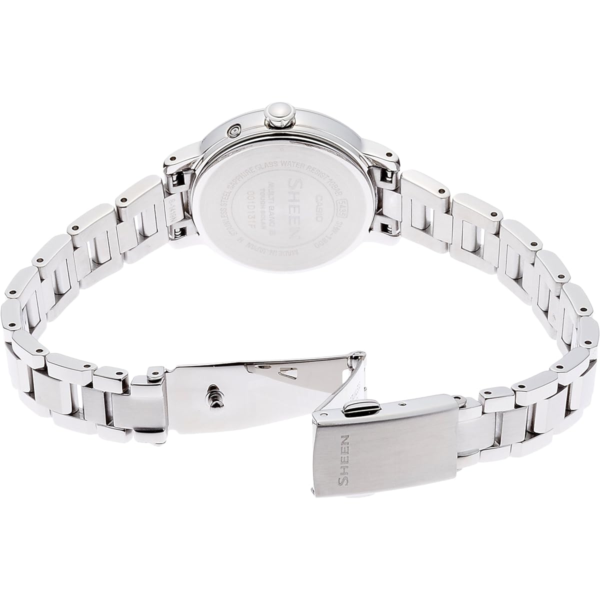 Brand description: "Live every moment properly." I love freedom. But please be sure to be on time. Because time is a precious treasure in order to live carefully and in your own way. It keeps accurate time for me on both ordinary days and special days. CASIO, SHEEN. A new model wearing the tricolor will be released from SHEEN's radio solar model "Voyage Series" equipped with Simple World Time *1, which is useful when traveling overseas. By coloring the indexes in order with the tricolor, which is a classic marine style of silver, blue, and red, it will brighten up your summer outfit. Furthermore, the index has a two-layer three-dimensional design, and the rounded shape creates a soft and pretty impression. The hand has a leaf motif, and the crown has a bud motif. It also features a fine adjustment bracelet that allows you to easily fine-tune the band size. Equipped with convenient functions such as tough solar powered by light such as fluorescent lights and an automatic second hand position correction function*2, you can use it with confidence while traveling. Introducing a model with a refreshing marine color design, a thin and easy-to-wear size, and smart and convenient functions. *1 Simple World Time: Simply pull the crown one click and set the second hand to the city code to quickly display the world time. It also automatically switches during daylight saving time, making it convenient for travel and business trips. *2 Automatic second hand position correction function: Checks the position of the second hand at regular intervals. In the unlikely event that the position of the second hand is misaligned due to magnetism or shock, the hand will be automatically corrected to the correct position. ●Tough solar (solar charging system) ●10 ATM waterproof function ●Radio reception function: automatic reception (up to 3 times/day)/manual reception