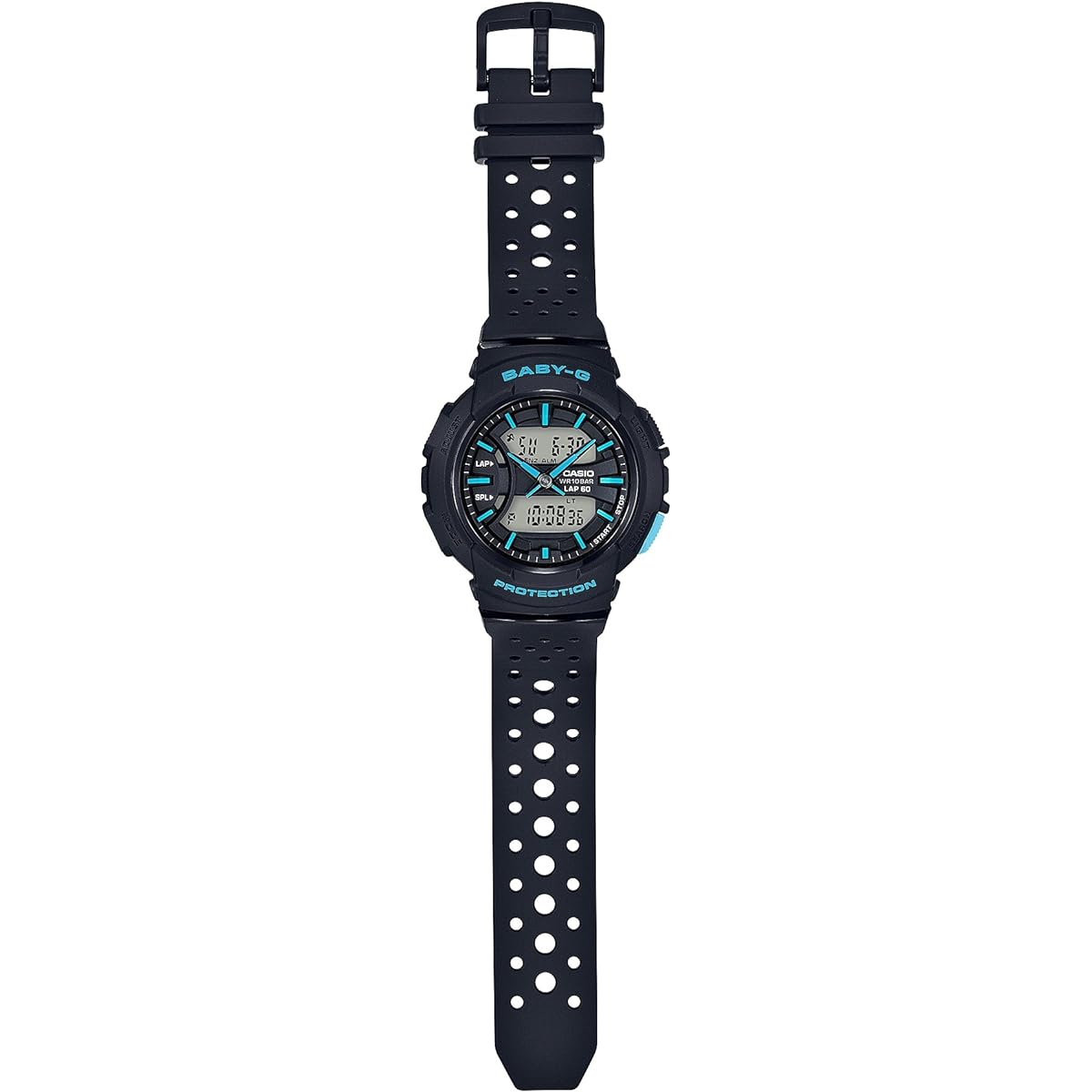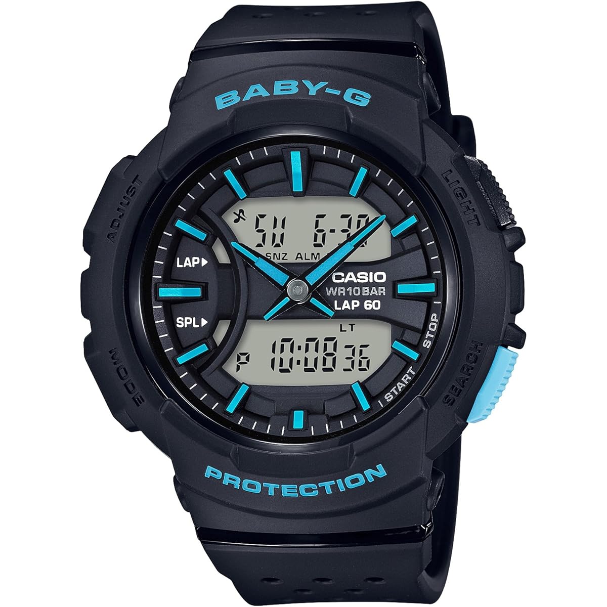 Brand Description: BABY-G is a casual women's watch brand born from G-SHOCK for active women. It has a shock-resistant structure that is resistant to shock and vibration, and is waterproof (over 10 atmospheres), making it safe for work around water or water sports, making it not only cute but also extremely practical. From the "BGA-240~for running~", which enhances your mood while running with its lap time measurement function and stylish design, a neon color model with a sporty feel is now available. This model is a stylish lineup that you can choose to match your favorite sportswear with black x light blue, light green x black, and white x lime green coloring. The band has a shape with many holes, inspired by the mesh material used in sports fashion items. This is a key point of the design and also improves breathability during sports. Coloring that goes well with sportswear, highly visible bar indexes, and sharp hour and minute hands with a sense of speed in mind enhance the exhilaration during sports. A protector is attached to the back of the band, making it easier to wear on the arm. In terms of functionality, the digital section displays the lap time, which measures the time it takes to travel a certain section and can store 60 lap times, and the split time, which measures the elapsed time from the starting point to any point. This function is very useful for setting target times and managing pace distribution when running. Introducing the cool BABY-G with coloring that goes well with sportswear. (This model is a black x light blue model.)●Shockproof structure●10 ATM waterproof function●Dual time●Stopwatch (1/100 seconds (lap less than 1 hour, split less than 10 hours)/1 second (lap 1 hour or more, split 10 hours or more), 100 hour meter, with lap/split), memory for 60 measurement data (data number, measurement start month/day/day of the week, lap/split time, lap/split number) ●Timer (Set unit: 1 minute, maximum set: 24 hours, measured in 1 second increments, auto repeat) ●3 multi-alarms (only one with snooze function)・Time signal ●Summer time setting function ●Full auto calendar ●12/24 hours Control display switching ●Operation sound ON/OFF switching function ●LED light (with auto light, afterglow function, and afterglow time switching (1.5 seconds/3 seconds))