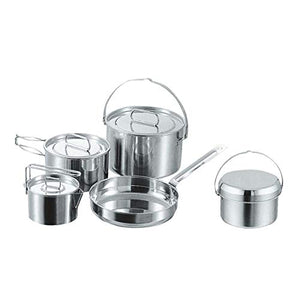 Set Contains: 1 x 7.9-inch (20 cm) Pot x 1, 1 x 6.3-inch (16 cm) Pot, 1 x 8.7-inch (22 cm) Pan, 1 x 30.4 fl oz (900 ml) Kettle cooker, 1 x Handle Size When Stored (External Diameter x H): Approx. 8.7 x 5.9 inches (220 x 150 mm) (Main component only) Weight: 4.4 lbs (2 kg) Material: Main Component, Lid, Handle: Stainless steel.