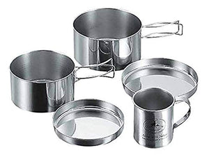 Weight: Approx. 19.4 oz (550 g) Material (Quality): 5.5 inches (14 cm) pot, 4.7 inches (12 cm) pot, 5.9 inches (15 cm) dish (lid), 5.1 inches (13 cm) dish (lid) Mug handle: Stainless steel Mug body: 18-8 stainless steel Specifications Others: Set Contents: Pot (5.5 inches 12 cm) x 1, 5.9 inches (15 cm) dish (lid) x 1, 5.1 inches (13 cm) dish (lid) x 1, mug x 1 Model Number: M-8578 Made in Japan