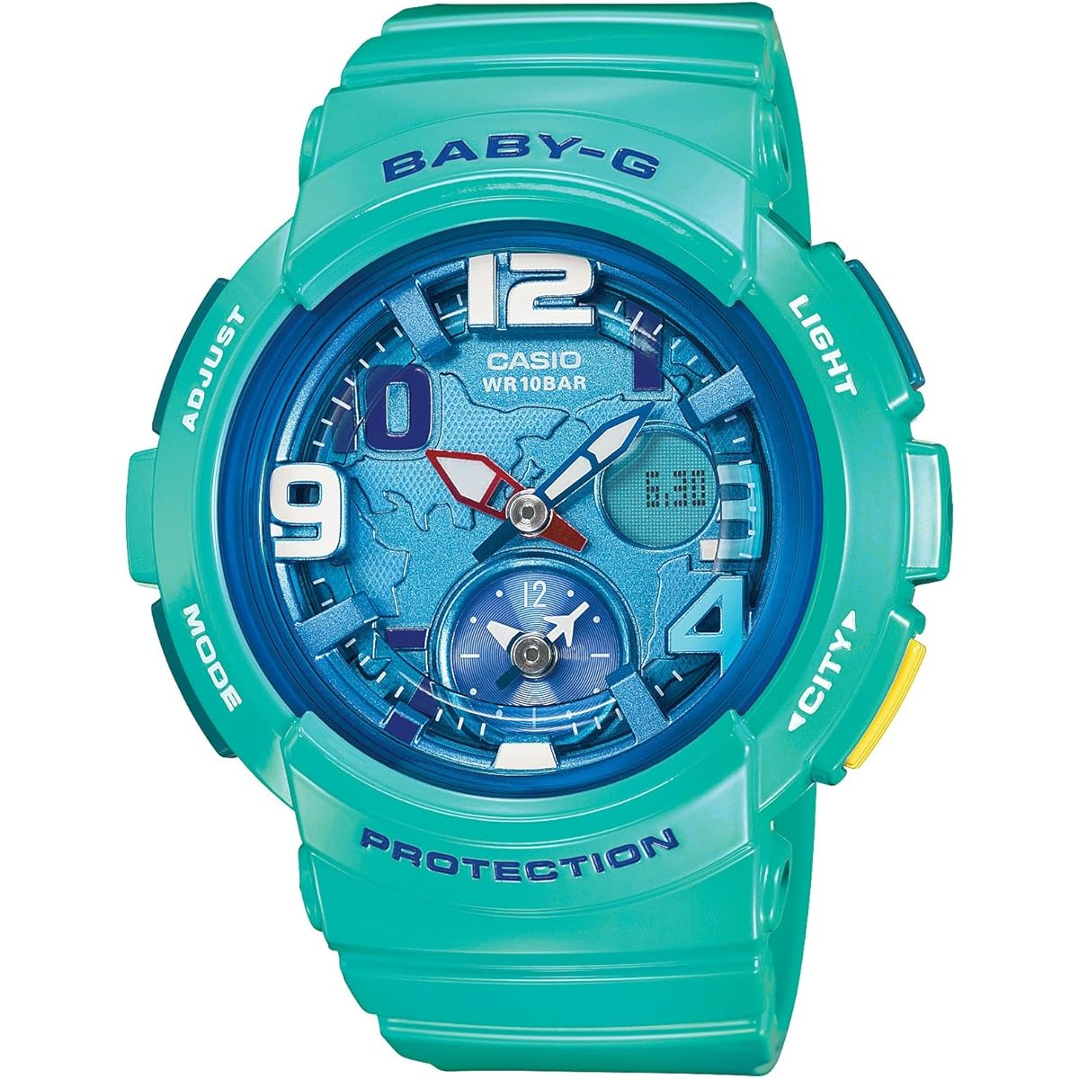 Brand Description: BABY-G is a casual women's watch brand born from G-SHOCK for active women. It has a shock-resistant structure that is resistant to shock and vibration, and is waterproof (over 10 atmospheres), making it safe for work around water or water sports, making it not only cute but also extremely practical. BABY-G, a casual watch for active women, introduces the ``Beach Traveler Series,'' which is equipped with a dual city time display function that is convenient for traveling. In addition to the hour and minute hands that indicate home time, the BGA-190 is equipped with a dual dial world time function that displays the time in two cities at the same time by laying out a 12-hour meter at the 6 o'clock position that indicates the time in 48 cities around the world. . We have improved usability when checking the time overseas and when traveling. You can switch between home time and world time by simply pressing the button at the 4 o'clock position. The case has a dome shape, inspired by the earth. The dial also features a three-dimensional world map, and the minute hand on the dial is shaped like a small airplane. It has a playful design that gives a global feel and enlivens the mood of traveling. Introducing BABY-G for women who live active lives on beaches around the world. ●Shock-resistant structure ●10 ATM waterproof function ●Hand retraction function (if the hands overlap with the LCD display and are difficult to see, you can temporarily retract the hands from above the LCD display)●World Time: 48 cities around the world ( 31 time zones, daylight saving time setting function) + UTC (Coordinated Universal Time) time display, home time city switching function ●Stopwatch (1 second, 60 minute meter, with split) ●Timer (set unit: 1 minute, maximum setting) :60 minutes, measured in 1 second increments) ●Time alarm/time signal ●Full automatic calendar ●12/24 hour display switching ●Operation sound ON/OFF switching function ●LED light (afterglow function, afterglow time switching (1.5 seconds/3 seconds))