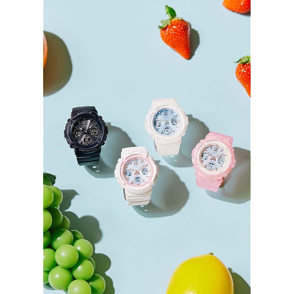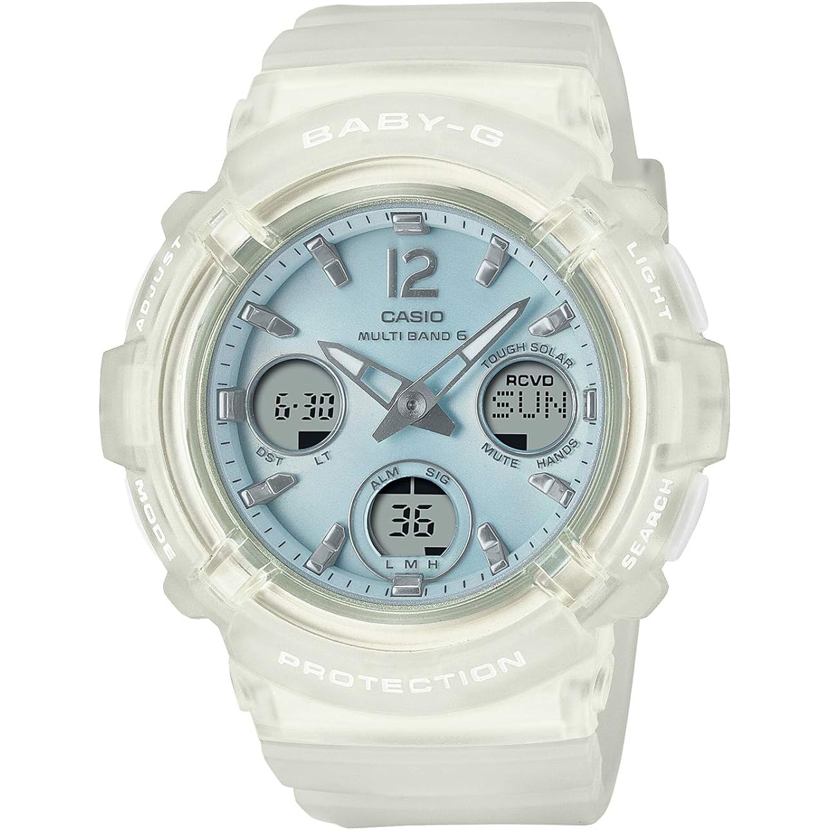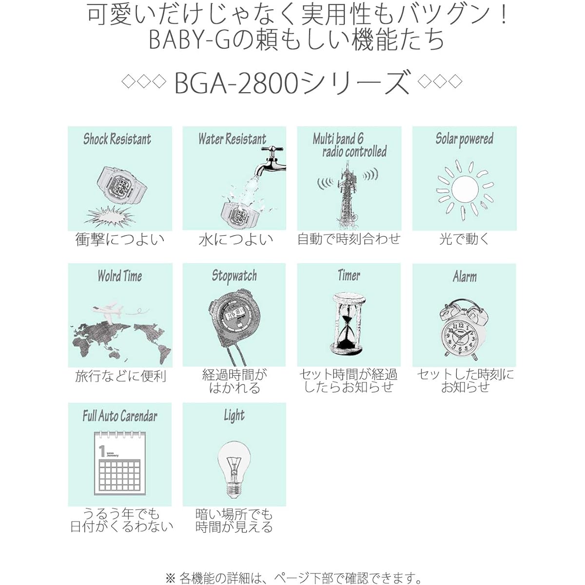 BABY-G is a casual watch for active women. BGA-2800 is a series characterized by a case design with a multi-layered structure made up of overlapping parts. The lineup of colors includes cool black, clean white, and cool pink skeleton and white skeleton. The voluminous form creates a sporty look while giving a cute impression. In terms of functionality, it has reliable features such as shock-resistant construction, 10 ATM water resistance, multi-band 6 that automatically adjusts the time by receiving radio waves from 6 stations around the world, world time, and tough solar. This watch is useful for traveling and leisure activities. ●Shockproof structure ●Tough solar (solar charging system) ●10 ATM waterproof function ●Radio reception function: automatic reception (up to 6 times/day) (up to 5 times/day for Chinese radio waves)/manual reception, reception radio waves :JJY, Frequency: 40kHz / 60kHz (model compatible with both Fukushima/Kyushu stations) Received radio wave: WWVB, Frequency: 60kHz Received radio wave: MSF/ DCF77, Frequency: 60kHz / 77.5kHz Reception Radio wave: BPC, Frequency: 68.5kHz *If you set the home time setting to a receivable city, you will receive stations tailored to the city. Please note that the time difference is set depending on the selected city. ●Hand retraction function (when the hands overlap with the LCD display and are difficult to see, you can temporarily retract the hands from above the LCD display)●World time: 48 cities around the world (31 time zones, with daylight saving time setting function) + UTC (Coordinated Universal Time) time display, home time city switching function ●Stopwatch (1/100 second, 60 minute meter, with split) ●Timer (set unit: 1 second, maximum set: 100 minutes, 1 second) (measured in units) ●5 time alarms (with countdown function)/time signal ●Battery indicator display ●Power saving function (turns off the display after a certain period of time in the dark to save power) ●Full auto calendar ●12/24 hours Control display switching ●Operation sound ON/OFF switching function ●Double LED light: LED light for dial (with full auto light, super illuminator, afterglow function, and afterglow time switching (1.5 seconds/3 seconds)), LED for LCD section Backlight (with full auto light, super illuminator, afterglow function, afterglow time switching (1.5 seconds/3 seconds)) ● When using the drive time function without solar power generation from full charge: Approximately 7 months power saving Condition: Approximately 18 months *If radio waves are not received, it will operate with normal quartz accuracy (average monthly difference of ±15 seconds).