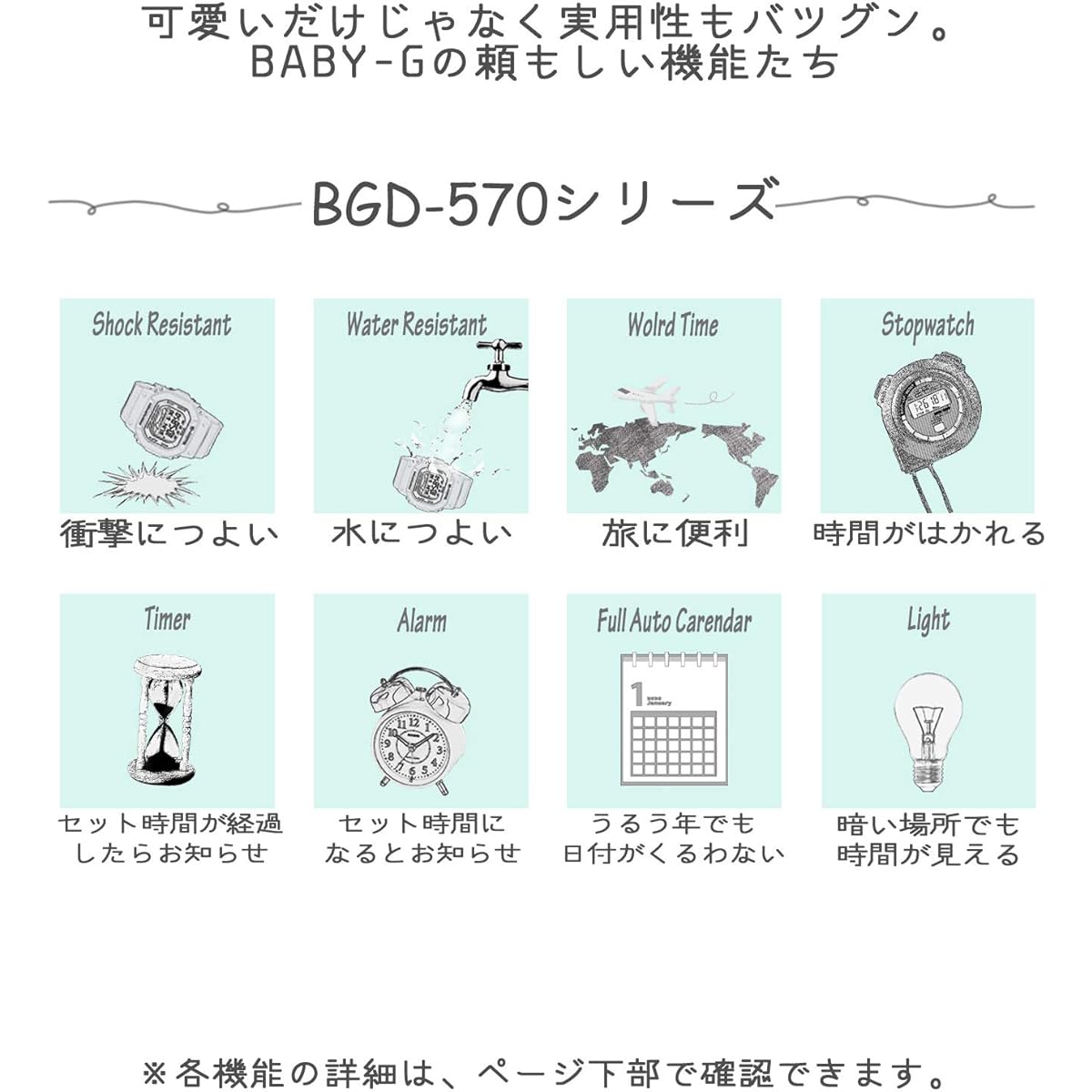 BABY-G, a casual watch for active women, introduces a new round face model with a classic look. The combination of square dial and round face gives it a retro and classic look. By keeping the entire item in one classic tone, you can create an item that gives off a sense of individuality while also being easy to match with a variety of fashion styles. By using a calming matte material, it has a clean look that is easier to wear. Introducing BABY-G, a basic outfit that goes well with everyday fashion. This is the pink model of BGD-570. ●Shockproof structure ●20 ATM waterproof function ●World time: Time display in 48 cities (29 time zones) around the world, with summer time setting function ●Stopwatch (1/100 second, 60 minute meter, with split) ●Timer (set unit: 1 minute, maximum setting: 24 hours, measured in 1 second increments) ●5 time alarms (only one with snooze function)・time signal ●Full auto calendar ●12/24 time format display switching ●Operation sound ON/OFF switching function ● EL backlight (with afterglow function) Brand introduction BABY-G is a casual women's watch brand born from G-SHOCK for active women. It has a shock-resistant structure that is resistant to shock and vibration, and is waterproof (over 10 atmospheres), making it safe for work around water or water sports, making it not only cute but also extremely practical.