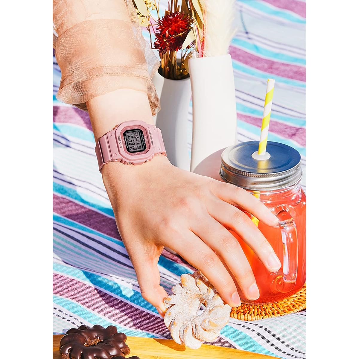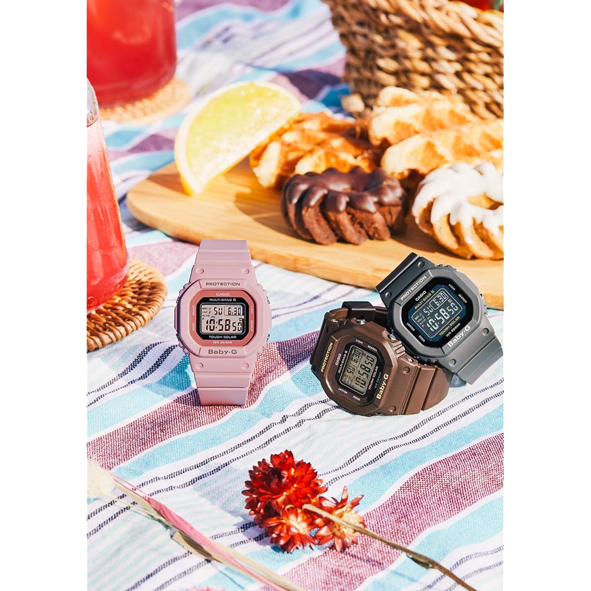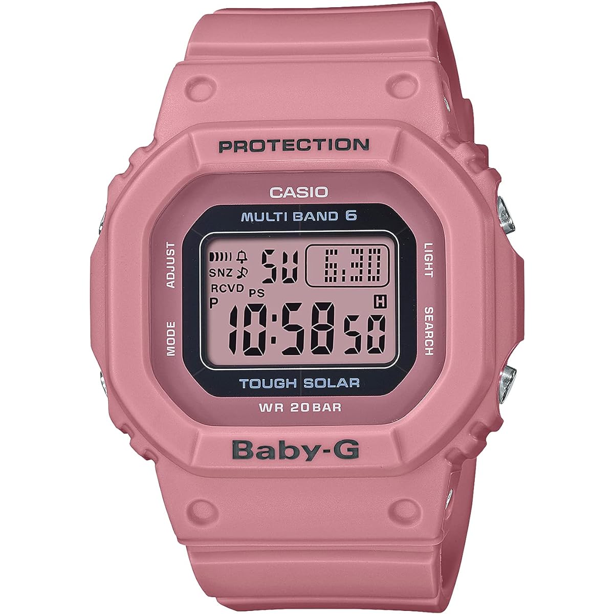 BABY-G is a casual watch for active women. This is an earth color tone model for a lifestyle where people base their lives in the city and travel to nature, with a crossover idea between the city and the outdoors, and the everyday and the extraordinary. BABY-G's standard square type BGD-5000 is available in three colors: smoky pink, matte brown, and matte gray. In terms of functionality, it supports standard radio waves from 6 stations around the world and is also equipped with tough solar. Furthermore, it is also practical as it is waterproof to 20 ATM. This earth color tone model matches urban outdoor fashion and has a wide range of uses, both in the city and outdoors. ●Shockproof structure ●Tough solar (solar charging system) ●20 ATM waterproof function ●Radio reception function: automatic reception (up to 6 times/day) (up to 5 times/day for Chinese radio waves)/manual reception, reception radio waves :JJY, frequency: 40kHz/60kHz (model compatible with both Fukushima/Kyushu stations) Received radio wave: WWVB, frequency: 60kHz Received radio wave: MSF/DCF77, frequency: 60kHz/77.5kHz Reception Radio wave: BPC, Frequency: 68.5kHz *If you set the home time setting to a receivable city, you will receive stations tailored to the city. Furthermore, the time difference is set depending on the set city. ●5 world times: time display in 48 cities around the world (31 time zones) + UTC (coordinated universal time), with home time city switching function ●Stopwatch (1/100 second (less than 1 hour)/1 second (1 hour) ), 24-hour meter, with split) ●Timer (set unit: 1 second, maximum set: 24 hours, measured in 1-second increments) ●5 time alarms (only one with snooze function)/time signal ●Battery indicator display ●Power saving function (turns off the display after a certain period of time in a dark place to save power) ●Full automatic calendar ●12/24 hour display switching ●Operation sound ON/OFF switching function ●Date display (month/day display switching) ) ●Day of the week display (switchable in 6 languages: English, Spanish, French, German, Italian, and Russian) ●LED backlight (with super illuminator, afterglow function, and afterglow time switching (1.5 seconds/3 seconds)) ●When fully charged Operating time without solar power generation When using the function: Approximately 11 months When using power saving mode: Approximately 22 months *If radio waves are not received, normal quartz accuracy (average monthly difference of ±15 seconds) It works.