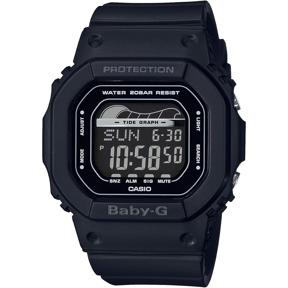 BABY-G's sports line with tide graph function "G-LIDE" introduces a model inspired by retro surf. This model uses a tide graph that allows you to check tidal information at surf points. The heights of low and high tides are displayed digitally to make it easier to visualize. In terms of design, in addition to the standard black and white, the lineup includes pastel blue and green models inspired by retro surfboards. It uses matte material and has a calm texture. In addition, the blue and green models have a surfboard silhouette design on the dial to add a sense of playfulness. Introducing BABY-G, which will liven up your summer beach activities with fashion and functionality. (This is black.)●Shockproof structure●20 ATM waterproof function●World time: Time display in 48 cities (29 time zones) around the world, with summer time setting function●Tide graph●Moon data (moon age)●Stopwatch (1/ 100 seconds, 24 hours meter, 5 seconds countdown auto start, with split) ●Timer (set unit: 1 minute, maximum set: 24 hours, measurement in 1 second increments, auto repeat, time-up notice function included) ●Multi alarm 3 Books (only one with snooze function) / Time signal ● Fully automatic calendar ● 12/24 hour display switching ● Operation sound ON/OFF switching function ● EL backlight (with afterglow function) ● Sound alarm flash function (alarm/time signal, (Timer notice/time up, stopwatch auto-start, alarm-linked light emitting) Brand introduction BABY-G is a casual women's watch brand born from G-SHOCK for active women. It has a shock-resistant structure that is resistant to shock and vibration, and is waterproof (over 10 atmospheres), making it safe for work around water or water sports, making it not only cute but also extremely practical.