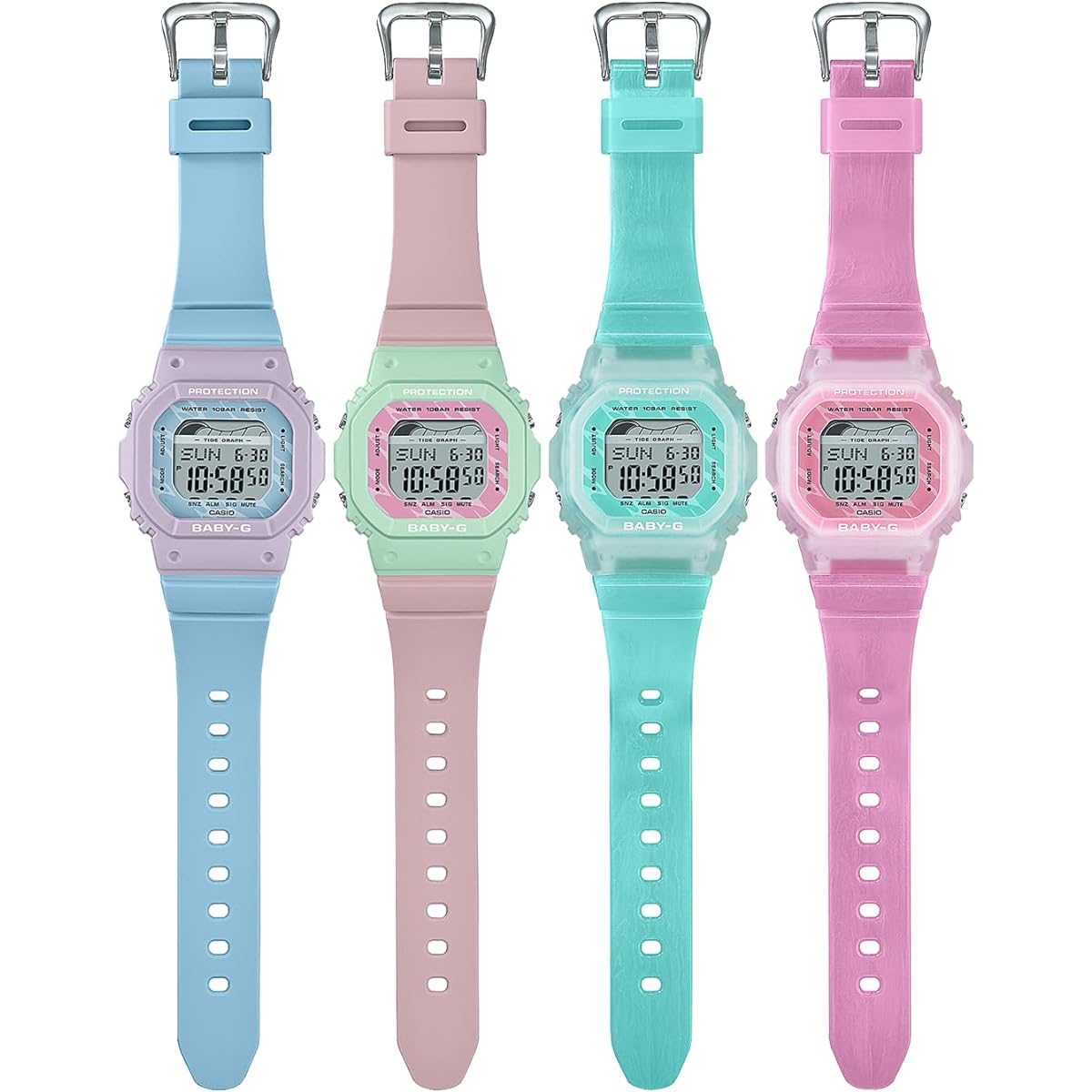 G-LIDE is the sports line of BABY-G, a casual watch for active women, with a tide graph function. BLX-565 is a model that is more compact than the previous model (BLX-560), and is characterized by a size that does not get in the way while surfing. The slow, classic longboarder surf style has been incorporated into a color and design with a surfboard and gentle waves as motifs. The face has a wave pattern, giving it a design reminiscent of the ocean. In addition, the colorful case and band are combined to create a bright and lively look. The BLX-565S has a marble pattern*1 created by mixed color molding on the band to express a wave pattern. In terms of functionality, it uses a tide graph that allows you to check tidal information at surf points. The tides are displayed digitally to make it easier to visualize. A compact G-LIDE that will brighten up your summer with colors and designs that look great on the beach. *1 There are individual differences in the marble pattern created by mixed color molding. ●Shockproof structure ●10 ATM waterproof function ●World time: 48 cities around the world (29 time zones, with daylight savings time setting function) ●Moon data (moon phase) ●Tide graph ●Stopwatch (1/100 second, 24 hour meter, with split, 5 seconds countdown auto start) - Timer (set unit: 1 minute, maximum set: 24 hours, measures in 1 second increments, auto repeat, time-up notice function included) - 3 multi-alarms (only one with snooze function) - Time signal ● Fully automatic calendar ● 12/24 hour display switching ● Operation sound ON/OFF switching function ● LED backlight (with super illuminator, afterglow function) [Set contents] Main unit, drawstring bag that can be reused as a pouch, handling Instructions and warranty are included with the instruction manual