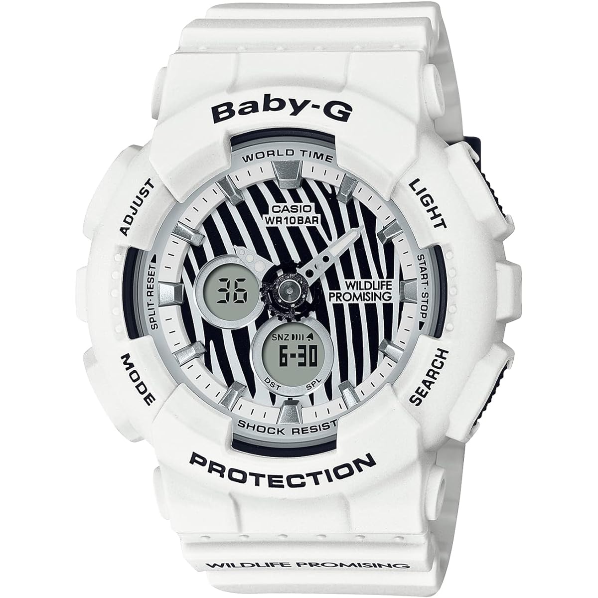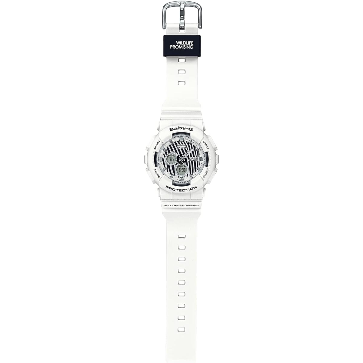 G-SHOCK/BABY-G has been creating collaborative models with various environmental organizations since the late 1990s and continues to support them. In 2021, we will continue to support the organization in sympathy with the activities of the certified NPO ``WILDLIFE PROMISING'', which aims to think about ``wildlife conservation'' and ``people's lives'' in Africa and coexist with them. This model is a pair watch themed on the Grevy's zebra, which lives in Kenya and is registered as an endangered wild animal by CITES. The thin and beautiful striped pattern of Grevy's zebra has been incorporated into the design of the watch. The base model uses GA-110 and BA-120. The WILDLIFE PROMISING logo is applied to the ring and band, and the symbol mark of "Love The Sea And The Earth" is engraved on the back cover. In addition, in our desire to contribute to creating a more sustainable society, we have adopted an environmentally friendly special package that does not use resin materials. All plastic materials in the box have been abolished, and recycled paper is used for the paper box. In addition, the watch product bag includes a 100% cotton drawstring bag that can be reused as a pouch. Introducing a special model born from the spirit of aiming for a better living environment for "wild animals and people". ●Shockproof structure ●10 ATM waterproof function ●World time: 27 cities around the world (29 time zones, daylight saving time setting function included) + GMT (Greenwich Mean Time) time display ●Stopwatch (1/100 second, 60 minute meter, with split) ●Timer (set unit: 1 minute, maximum set: 60 minutes, measurement unit: 1 second, auto repeat, time-up notice function included)●5 time alarms (only one with snooze function)・time signal ●Full auto calendar● 12/24 hour display switching ●LED light (with afterglow function, afterglow time switching (1.5 seconds/3 seconds))