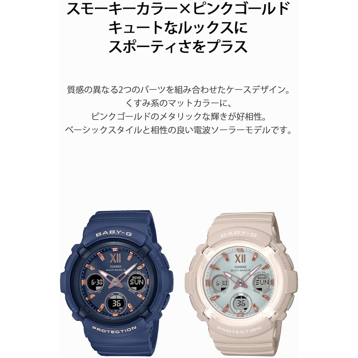 This is a radio solar model that goes well with basic style. Shock-resistant structure Tough solar (solar charging system) Water resistant to 10 ATM Radio reception function: Automatic reception (up to 6 times/day) (up to 5 times/day for Chinese radio waves)/Manual reception, reception radio waves: JJY, frequency :40kHz/60kHz (model compatible with both Fukushima/Kyushu stations) Received radio waves: WWVB, Frequency: 60kHz Received radio waves: MSF/DCF77, Frequency: 60kHz/77.5kHz Received radio waves: BPC, Frequency: 68.5kHz *If you set the home time setting to a receivable city, you will receive stations tailored to your city. Please note that the time difference is set depending on the selected city. Hand retraction function (If the hands overlap the LCD display and are difficult to see, you can temporarily retract the hands from above the LCD display.) World Time: 48 cities around the world (31 time zones, with daylight saving time setting function) + UTC (Coordinated Universal Time) time display, home time city switching function Stopwatch (1/100 second, 60 minute meter, with split) Timer (set unit: 1 second, maximum set: 100 minutes, measured in 1 second increments) Time 5 alarms (with countdown function) / time signal Battery indicator display Power saving function (turns off the display after a certain period of time in a dark place to save power) Fully automatic calendar 12/24 hour display switching Operation sound ON/OFF switching function Double LED light: LED light for dial (full auto light, super illuminator, afterglow function, with afterglow time switching (1.5 seconds/3 seconds)), LED backlight for LCD section (full auto light, super illuminator, afterglow) function, with afterglow time switching (1.5 seconds / 3 seconds)