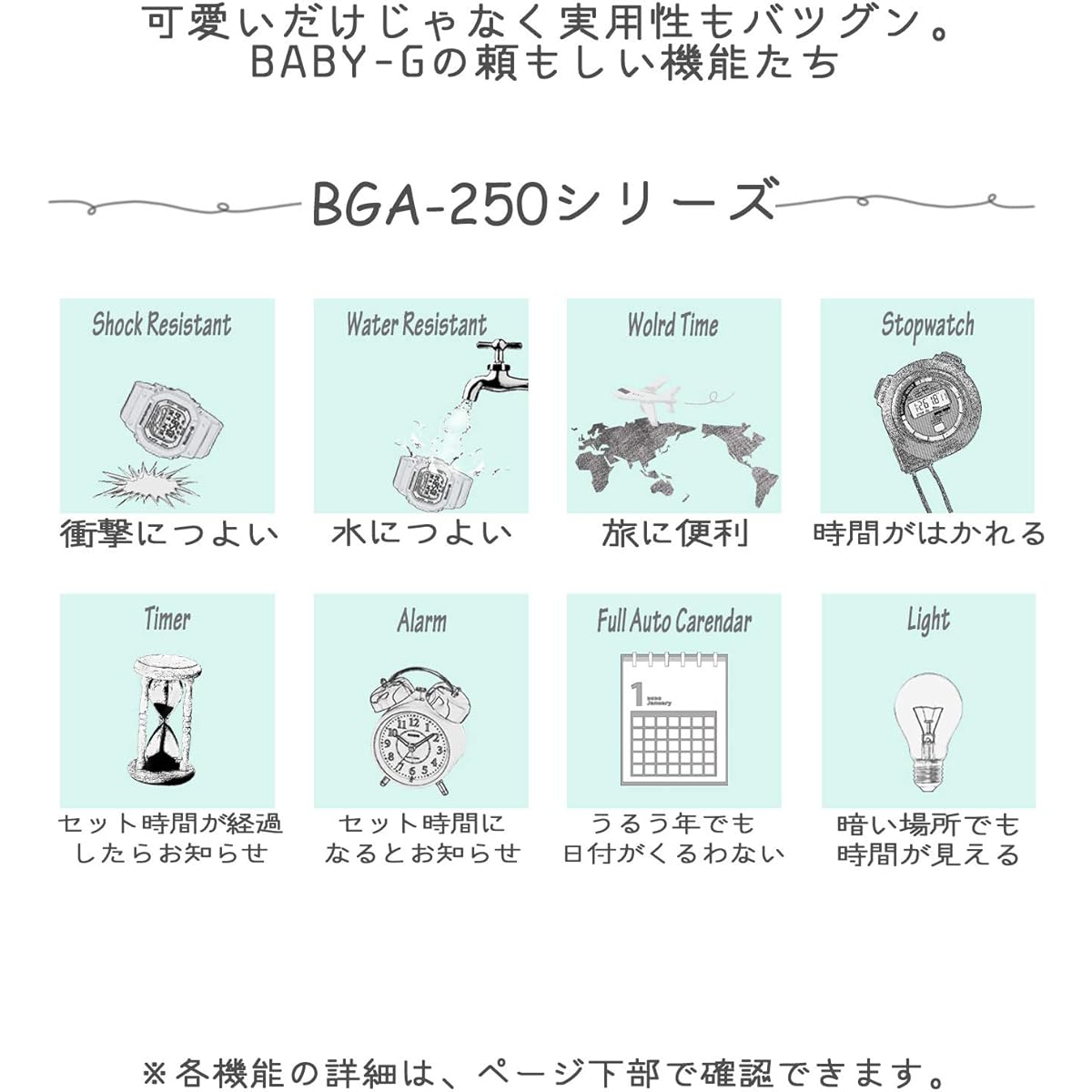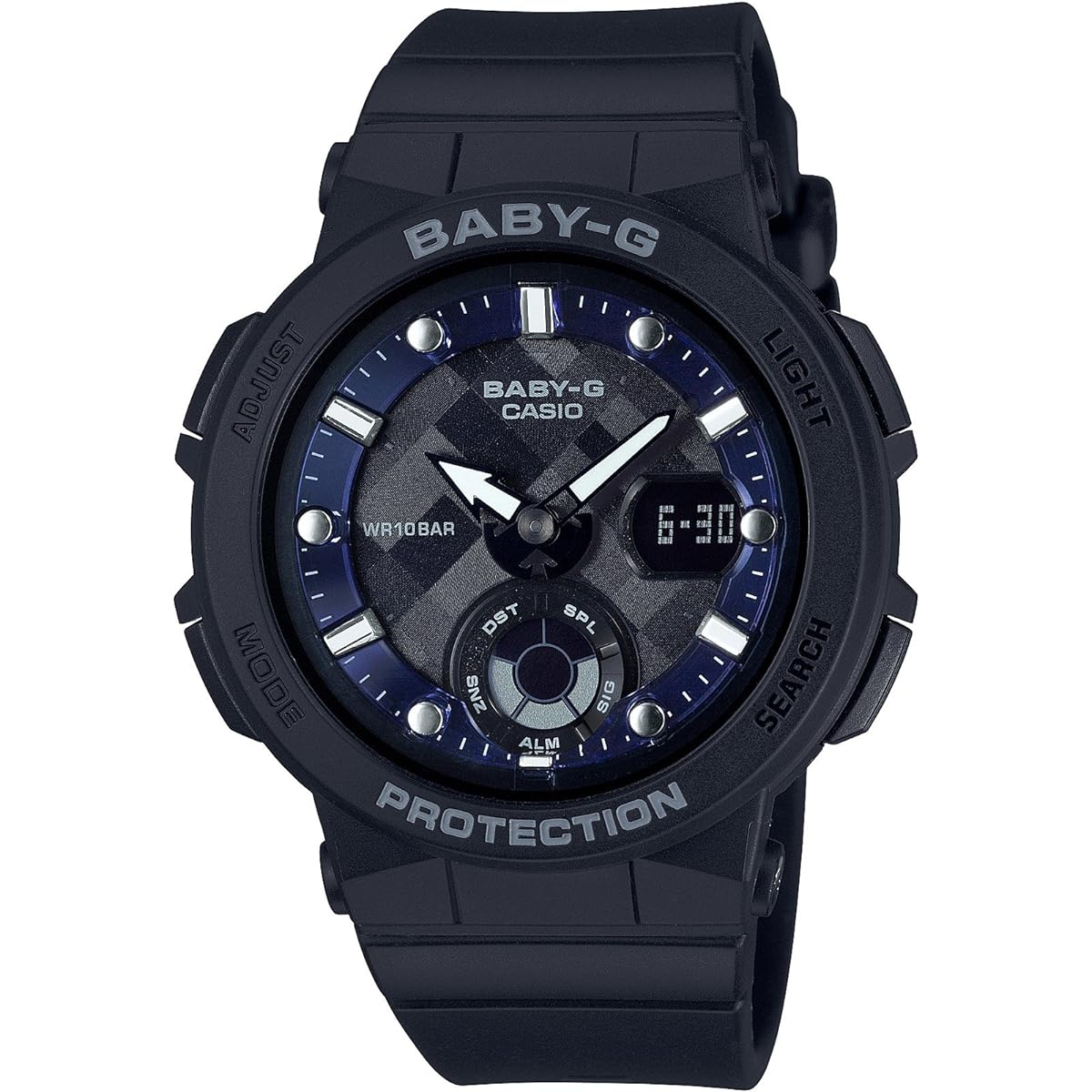 From BABY-G, a casual watch for active women, the ``Beach Traveler Series'' with a summer beach theme is now available. This model is a series with the theme of beautiful things seen around the beach. Each model is colored in black reminiscent of the night view of the city along the beach, blue reminiscent of the crystal clear sea, pink of seashells that sparkle reflecting sunlight, and white of pure white sand. The design evokes happy summer memories and favorite scenery, and lifts your mood. Skeleton material is used for the parting part of the dial to represent the surface of the ocean. The hour and minute hands and parting index feature rudder and anchor motifs, perfect for beach activities. The index uses a bar index and has a simple finish. It is also equipped with a neon illuminator that makes the face glow in response to the built-in black light. When the light is turned on, the hour and minute hands glow in pink and green, reminiscent of the magical night sea. The BGA-2500 is equipped with reliable functions such as Multiband 6, which automatically adjusts the time by receiving radio waves from 6 stations around the world, World Time, and Tough Solar. Introducing BABY-G, which will liven up the travel and beach activity scene for the summer. (This model is BGA-250 in black.)●Shockproof structure●10 ATM waterproof function●World time: 27 cities around the world (29 time zones, with summer time setting function) + GMT (Greenwich Mean Time) time display ●Stopwatch (1 second, 60 minute meter, with split) ●Timer (set unit: 1 minute, maximum set: 60 minutes, measures in 1 second increments, auto repeat, time-up notice function included) ●5 time alarms (1 Book only with snooze function) / Time signal ● Fully automatic calendar ● 12/24 hour display switching ● LED light (neon illuminator, with afterglow function, with afterglow time switching (1.5 seconds/3 seconds)) Calendar function *Full auto Calendar Dial Digital & Analog Separate Women's Radio Wave Receiving Function Non-drive Quartz Brand Introduction BABY-G is a casual women's watch brand born from G-SHOCK for active women. It has a shock-resistant structure that is resistant to shock and vibration, and is waterproof (over 10 atmospheres), making it safe for work around water or water sports, making it not only cute but also extremely practical.
