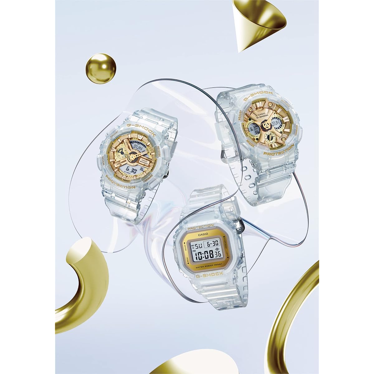 G-SHOCK is a toughness watch that continues to evolve in pursuit of insatiable strength. This model has a summer-like freshness and elegance. The base model is the standard square type GMD-S5600. The clear skeleton band is combined with a gold vapor-deposited dial to create a design that is easy to style as an accessory. ●Shockproof structure ●20 ATM waterproof function ●Stopwatch (1/100 seconds (00'00"00 to 59'59"99)/1 second (1:00'00" to 23:59'59"), 24 hours (with meter, split) ●Timer (set unit: 1 second, maximum set: 24 hours, measurement in 1 second increments, auto repeat) ●Multi-alarm/time signal ●Full auto calendar ●12/24 hour display switching ●LED backlight (Super illuminator, with afterglow function) Sound alarm flash function (alarm/hourly signal/timer sound linked light emission)