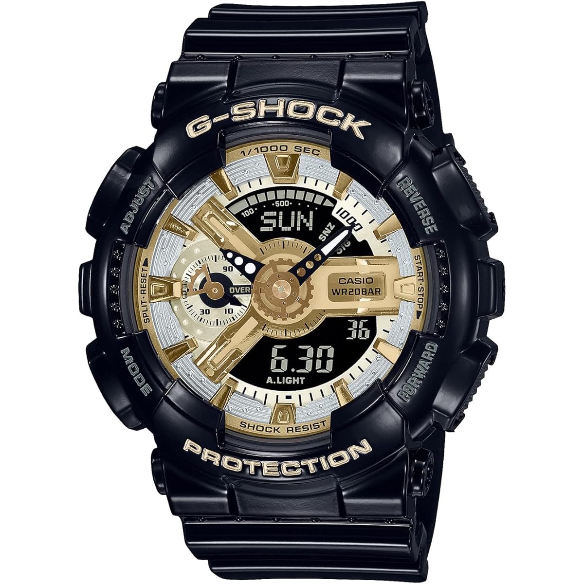 This is a smaller model of the "GA-110", which features a three-dimensional face design made of stacked small parts. The black body typical of G-SHOCK is colored in two tones of energetic sparkling gold and stylish silver. A small G-SHOCK perfect for youth culture that follows casual fashion trends. ●Shockproof construction ●Magnetic resistant watch (JIS 1st class) ●20 ATM waterproof function ●World time: 48 cities around the world (29 time zones, with summer time setting function) + UTC (Coordinated Universal Time) time display, home time city switching function ●Stopwatch (1/1000 second, 100 hour meter, speed measurement function (MAX1998unit/h, 2unit/h unit), lap/split measurement switching) ●Timer (set unit: 1 minute, maximum set: 24 hours, 1 second unit) measurement, auto-repeat) ●5 time alarms (only one with snooze function), time signal ●Full auto calendar ●12/24 hour display switching ●LED light (auto light function, afterglow function, afterglow time switching (1.5 seconds) /3 seconds) [Set contents] Main unit, box, instruction manual, and warranty are included with the instruction manual