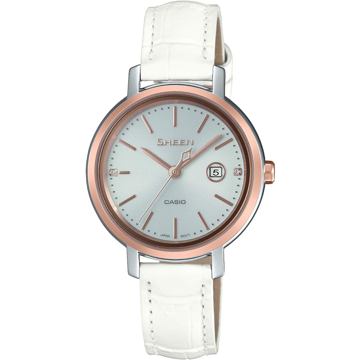 A model with a minimal design will appear from "SHEEN", which expresses "sparkle and sparkle" with feminine designs and functions. An easy-to-use solar model with a minimalist, simple and wide-face design. Pink gold x silver bicolor model SHS-4525SPG, SHS-4525CG with an elegant and natural shine and SHEEN's exclusive color "Peach Gold IP" that brightens and brightens the skin wearing the watch, pink gold case We now have the SHS-4525PGL, which combines a white leather band. Due to its simple design with a plain face and bar indexes, it is a model that is easy to use in daily life, regardless of whether it is on or off. The wide face provides excellent visibility. Furthermore, sparkling crystals are placed at the 3 o'clock and 9 o'clock positions, and the second hand is designed with a shape that evokes the image of brilliance. It adds a touch of elegance to its simplicity. In terms of functionality, it is equipped with convenient functions such as a solar charging system and a date display, making it practical as well. Furthermore, it uses sapphire glass with anti-reflection coating that is scratch resistant and highly transparent. Introducing a model that will add a touch of glamor to your hands with its trendy simple design and soft colors. This is a model that combines a pink gold case and a white leather band. ●Solar charging system ●Waterproof to 5 ATM ●Battery charging warning function ●Date display ●Driving time from full charge to stop of hand movement: Approximately 5 months Brand introduction "Live every moment properly." I love freedom. But please be sure to be on time. Because time is a precious treasure in order to live carefully and in your own way. It keeps accurate time for me on both ordinary days and special days. CASIO, SHEEN.