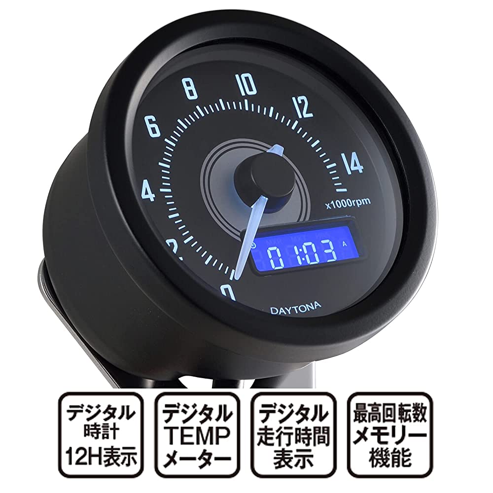 DAYTONA Velona 22024 Electric Tachometer, Black Body, White LED, Diameter 2.4 Inches (60 mm), 15,000 RPM Display.