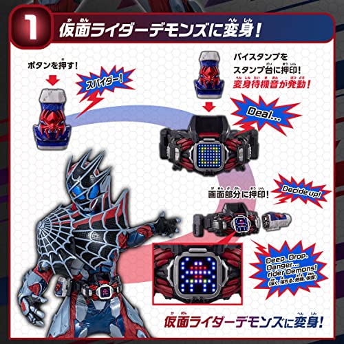 Introducing the Transformation Belt DX Demons Driver, equipped with 64 LED lights from Kamen Rider Revice. Transform into Kamen Rider Demons with the included Spider by Stamp. of the belt when you transform into Kamen Rider Demons in the movie. Press the button on the included Spider Bypress to "Spider!" standby sound of the transformation from the main unit. When you press the Spider By Stamp on the center screen of the main unit while you activate the transformation sound to Kamen Rider Demons along with the LED animation, so you can enjoy the role of pretending play After transformation, press the button on the top of the spider by stamp, and press it on the center screen of the main unit to activate the special attack standby sound. Push both sides of the unit to activ ate a special trick. You can also press the DX bi-stamp series (sold separately) onto the screen to recreate the genomic change from the movie. Push both sides of the belt twice to activate special trick-standby sound. pushing both sides of the device, the special trick sounds unique to up to 4 types of DX bi-stamp series remembered during a genomic change.