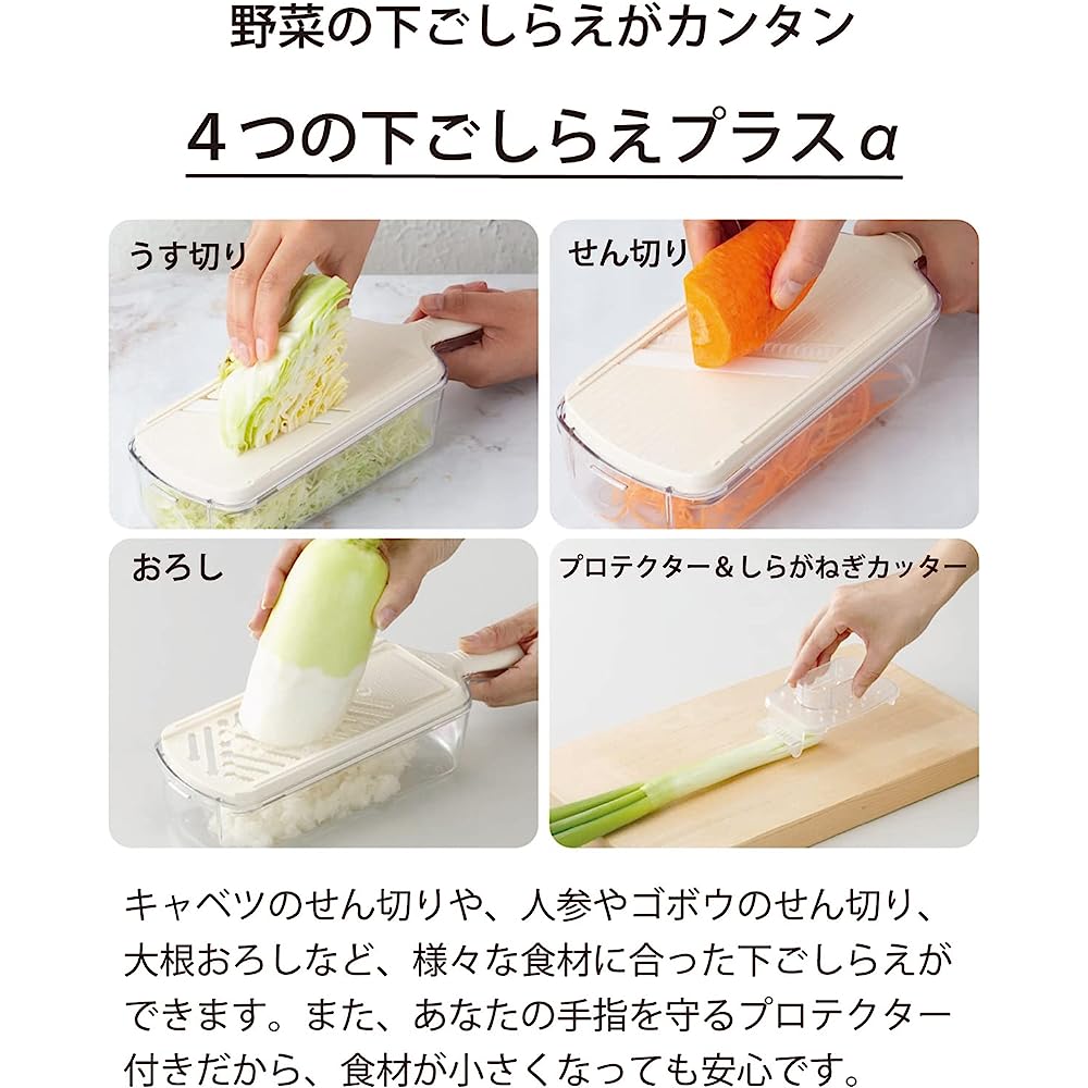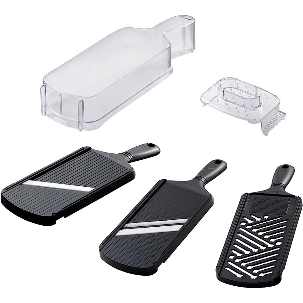 - Convenient features in one package: The rubber grip makes it easy to grip.The ceramic blade makes this slicer light, fast and clean-cutting.Store thin slicer (variable type), shredder, grating plate, protector (with white onion cutter), and container (with anti-slip) in one place