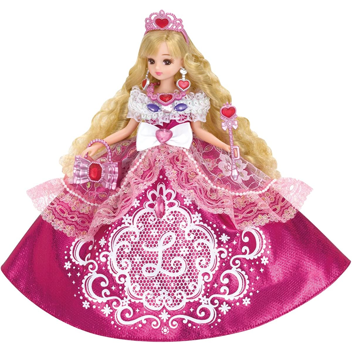This is Licca-chan wearing a dazzling pink dress with long wave hair from the Yumemuru Princess series. Accessories included Set Contents: Doll (dress, earrings, underwear) (1), shoes (pumps) (1), tiara (2), necklace (3), earrings (1), stick (1), bag (2), perfume (1), lip (1).