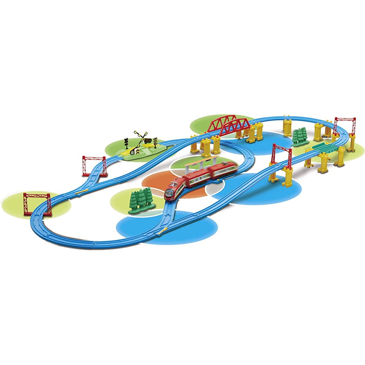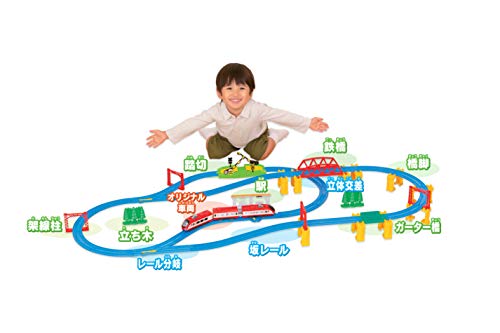A special 60th anniversary set that you can enjoy playing with Plarail. Scenery is a great choice. A gorgeous rail set that allows you to enjoy the 3D layout. Includes the original design "Red Flyer" express vehicle. Safe for beginners. Easy play guide included. ■The original vehicle can be separated between 2 speeds, and 3 cars. ■Re-enforced ■The third part is equipped with a coupler, so it can be connected to the same ■ Combine with other Plarail products sold separately, for even more fun. Set Contents: Original vehicle 3-car construction (1), straight rail (2), 1/2 straight rail (1), turnout rail L( 1), turnout rail R(1), curved rail (14), 1/4 straight rail concave (2), 1/4 straight rail convex (1), 1/4 straight rail concave (1), stop rail (1 ), garter bridge (1), New hill rail (2), block bridge legs (10), steel bridge frame (1), small step (1), crossbar (for single wire) (4), standing wood (2) , station (1), layout guide (1). 1), User Seal ( 1), Parts Order (1),