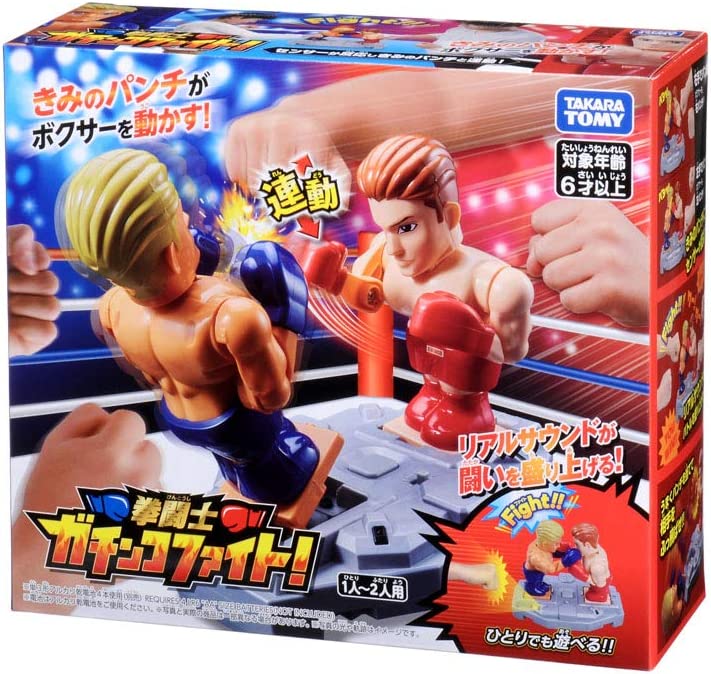 The new sensation battle game "Fist Gachin Copfight". No gloves needed! Liven up the hot battles with the sound product! You can even play it alone with CPU battle mode. Infrared sensor lets the boxer figure punch as the player's fist moves When the punch hits your face, the boxer figure will disappear from the base and become a "lose". 2P mode allows 2 players to play and in 1P mode you can play with the CPU for one person. Set Contents: Boxer figures (2), main body (1), consumer label (1), instruction manual (1),