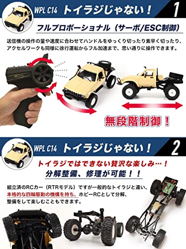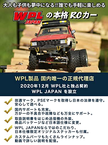Realistic 1/16 scale RC car: The C14 is so realistic that everyone will want to think of the real thing. Just run it and you'll be excited! 4 (4WD) known as cross-country vehicles or rock crawlers that are designed for off-road driving. Full proportional (servo/ESC controlling): You can cut the handle slowly and quickly according to the amount and speed of the transmitter, and you can operate the acceleration from gradual operation to full acceleration. with detailed details like the real vehicle, and the realistic appearance and powerful four-wheel drive feature is also OK for locking sections. You can enjoy the realistic and thrilling rock crawling. (Safe to Play) It is also compatible with Japanese radio laws. You can play with confidence. The Radio Law is a Japanese proprietary law that regulates radio waves such as mobile phones, Wi-Fi, Bluetooth, etc. After completing the inspection by a certified agency established by the Department of Office, it is approach ved for use and granted a "Technical Compliance Mark". WPL JAPAN is an authorized reseller of WPL Japan, not only includes instructions and boxes Includes original stickers only from authorized dealers. We also provide support by staff in Japan. Easy to Operate: Luxurious fun that a toy radio cannot do. This is a pre-assembled RC car (RTR model), but unlike a typical toy radio, it can be disassembled and maintained as a hobby RC. Customize your own painting or custom parts. not to be able to make the actual car exactly as it is in the real car. (Perfect as a Gift) Full set for high cost performance. Ready to run and play! No difficult assembly required, straight out of the box! includes the main unit, transmitter, 7.4 V battery for driving, and a USB charging cable. (*2 AA batteries for transmitter are not included); WPL JAPAN is the perfect gift for your child.
